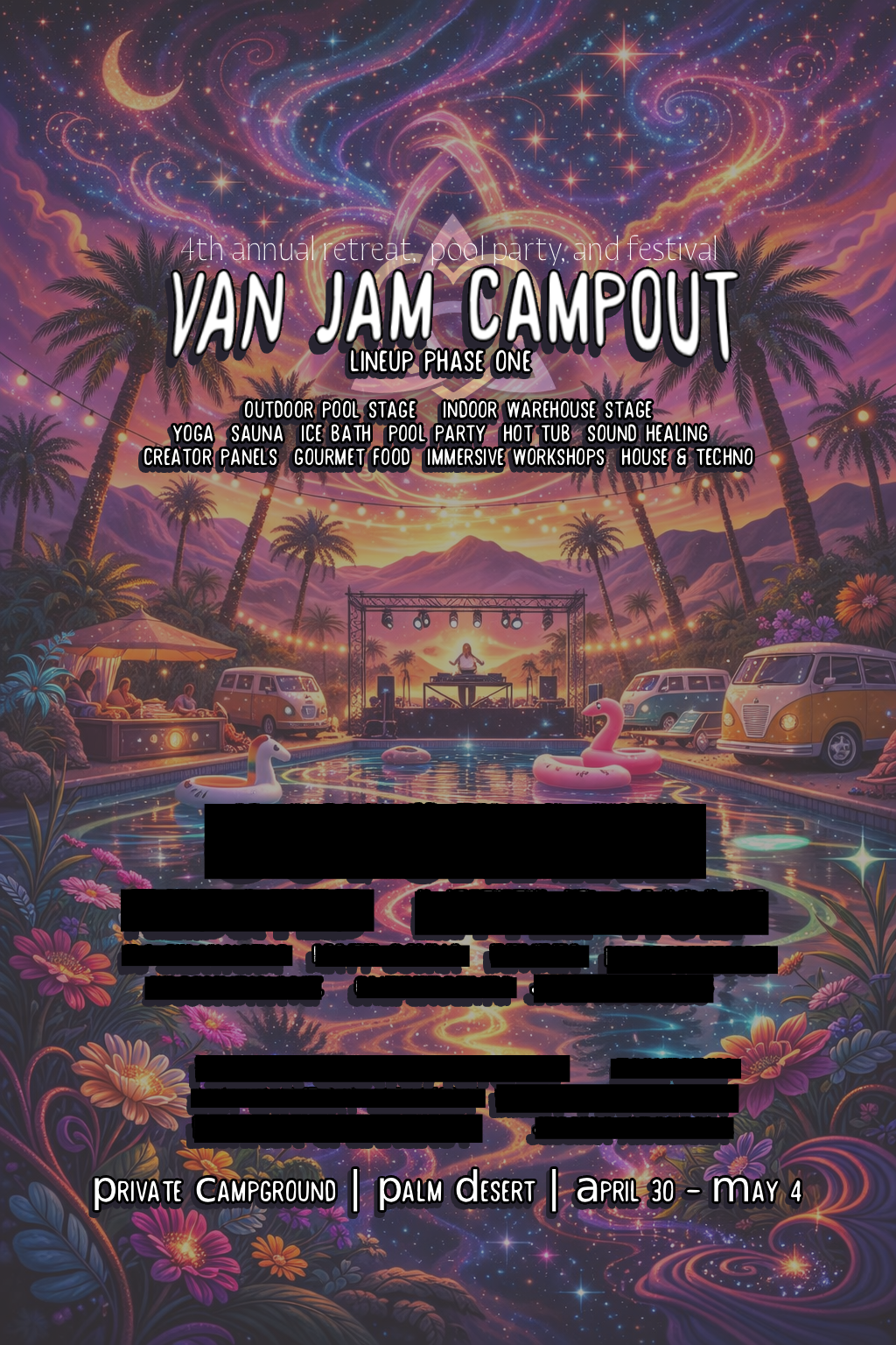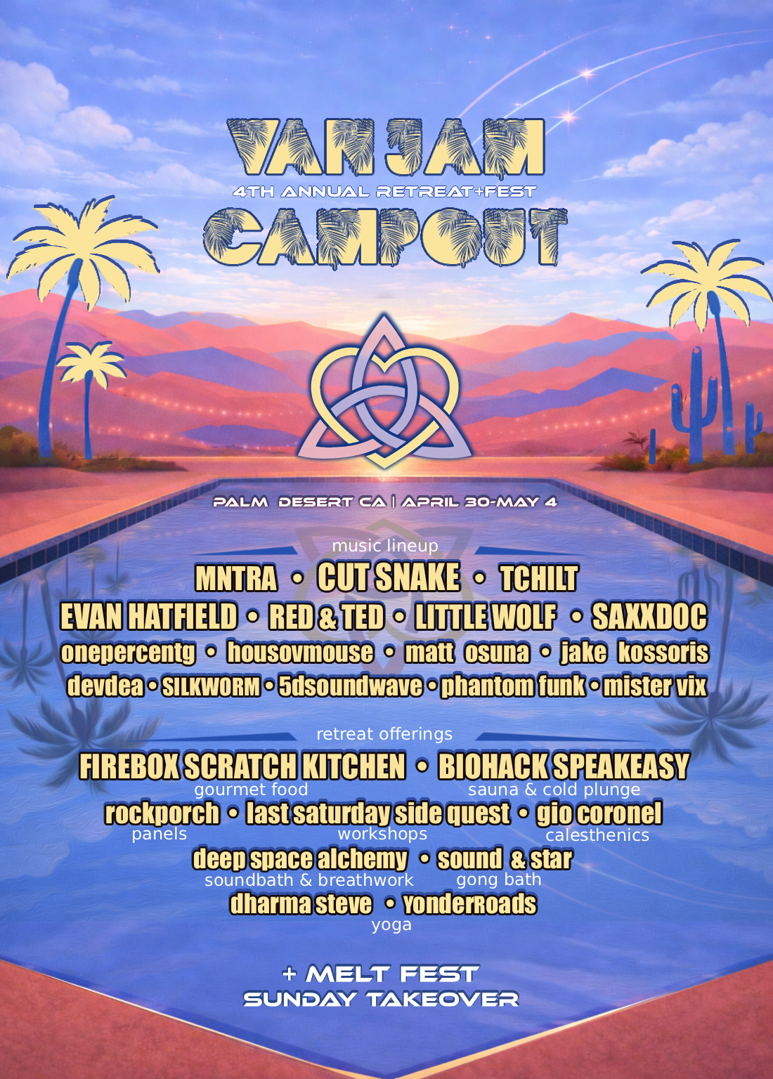 LATE EXIT REQUIRED AFTER 2PM | am: yoga. breathwork. gong bath. breakfast: firebox. pool party. noon: closing ceremony. pm: tba. all day: biohack bus sauna.